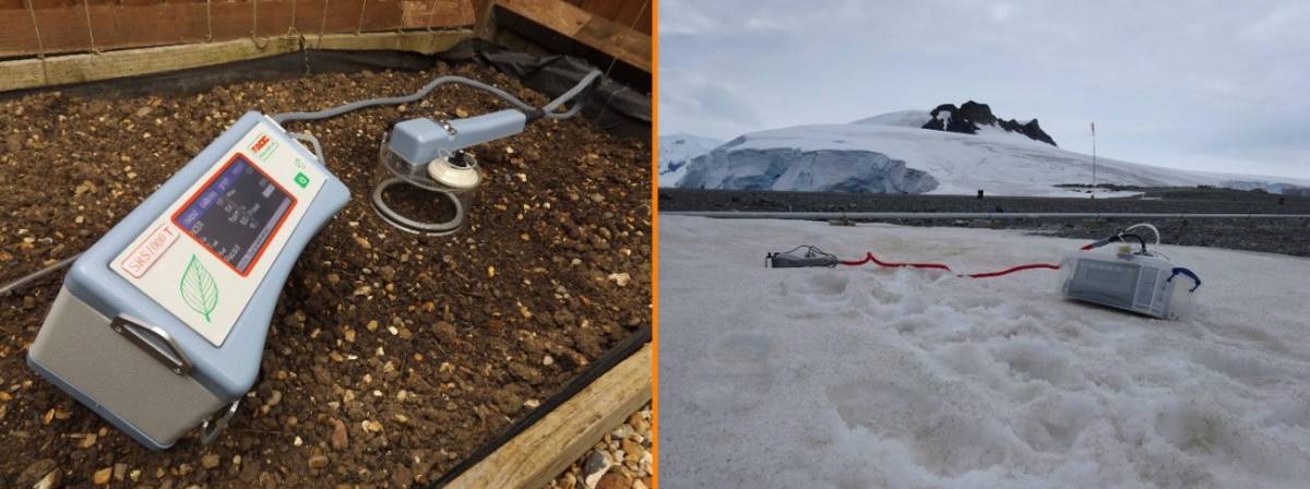 上图左为主机加土壤呼吸室测量土壤呼吸实例照片,上图右为英国剑桥科研人员使用该系统在南极洲测量土壤呼吸与藻类光合作用现场照片。